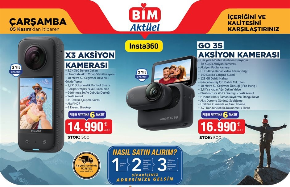 BİM marketler zincirinin hafta içi aktüel ürün kataloğunda aksiyon kamerası segmentinin beğenilen isimlerinden Insta360 markasının popüler iki aksiyon kamerası modeli satışa sunulacak.
