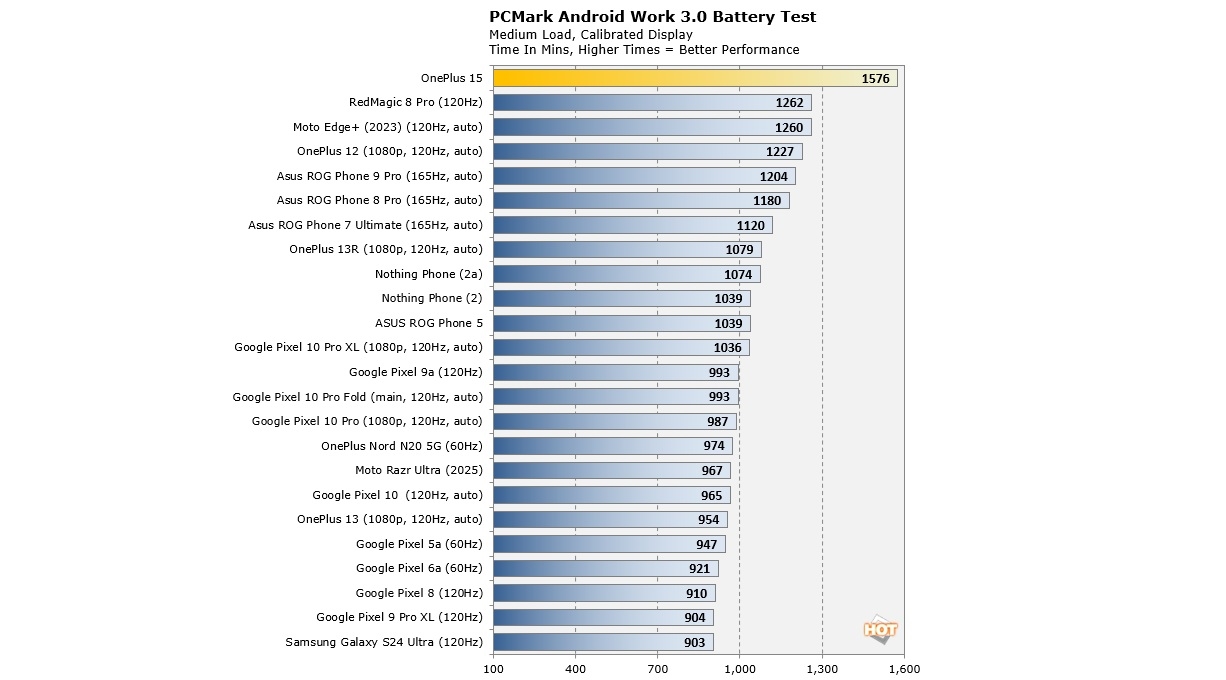 Kaçıranlar için OnePlus 15’in bataryası iki adet 3.650mAh silisyum-karbon hücreden oluşuyor. Performans tablosunun devamında ise, RedMagic 8 Pro (1.262 dakika), Moto Edge+ 2023 (1.260 dakika) ve OnePlus 12 (1.227 dakika) gibi modeller yer alıyor. Google Pixel 10 Pro Fold, Pixel 9a veya Samsung Galaxy S24 Ultra gibi modeller ise 900-1.000 dakika aralığında değerler elde etti. OnePlus 15’in bu başarıyı tek başına batarya kapasitesiyle elde etmediğini de eklemek gerek. Şirketin yazılım tarafında yaptığı optimizasyonlar ve Snapdragon 8 Elite Gen 5’in güç yönetimi, test boyunca kararlı bir tüketim eğrisi sunmuş görünüyor.