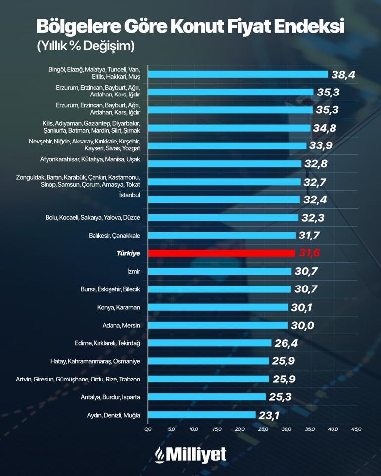 Reel bazlı fiyat artışlarında doğu illeri önemli ölçüde yükselişler gösterdi. Özellikle tüm doğu illerinde artışlar yaşandığını söyleyebiliriz. Doğu Anadolu illerimizde fiyat artışları Türkiye ortalamasının üstünde. Bu illere baktığımızda Erzurum, Erzincan, Bayburt, Ağrı, Ardahan, Kars gibi şehirler geliyor ki burada yaklaşık %35 oranında Konut Fiyat Endeksi artış gösterdi. Bingöl, Elazığ, Malatya, Tunceli, Van, Bitlis, Hakkari ve Muş da yüzde 35 seviyesinin üstündeki iller diyebiliriz.