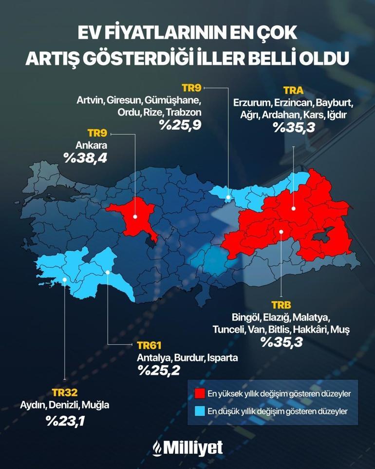 Fiyat artışının en az olduğu illere baktığımızda Aydın, Denizli, Muğla, Antalya, Burdur, Isparta’da fiyatlar Türkiye ortalamasının altında kaldı. Burada Konut Fiyat Endeksi’ndeki artış yüzde 25 seviyelerinde oldu. Doğu Karadeniz illerinde de fiyat artışları bu seviyelerde oldu. Özellikle Trabzon, Ordu, Rize, Gümüşhane, Artvin, Giresun illerinde de reel bazlı fiyat düşüşleri etkili oldu.