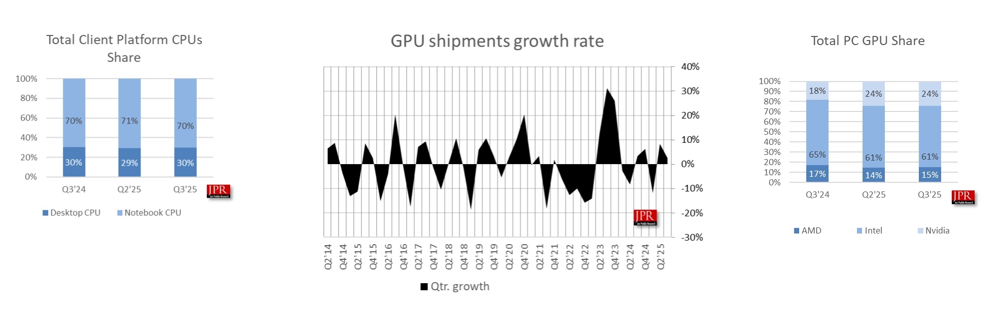 Ekran kartı pazarında uzun süredir yaşanan talep düşüşleri ve sevkiyat sorunları halen çözülebilmiş değil. Son olarak Jon Peddie Research (JPR), PC pazarına ilişkin 2025 üçüncü çeyrek verilerini paylaştı. Rapora göre toplam GPU sevkiyatları önceki çeyreğe göre yüzde 2,5 artarak 76,6 milyon adede ulaştı. AMD ise hem GPU hem CPU cephesinde payını bir miktar artırmayı başardı.