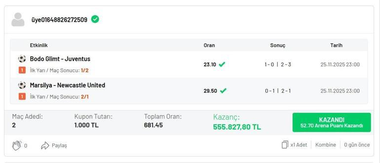 Kupondaki diğer maç ise yine UEFA Şampiyonlar Ligi’ndeki Marsilya-Newcastle United karşılaşmasıydı. Üye, bu karşılaşmaya yine ilk yarı/maç sonucu tahmini yaptı ama bu kez “2/1” tercihinde bulundu. Newcastle United, maçın başında bulduğu golle Marsilya deplasmanında ilk yarıyı önde tamamladı. İkinci yarının hemen başında ise Marsilya’nın tecrübeli golcüsü Pierre-Emerick Aubameyang, art arda 46 ve 50. dakikalarda sahneye çıktı. Gabonlu yıldızın 2 golüyle Marsilya, geri dönüşü ikinci yarının başında tamamlamış oldu ve kalan dakikalarda skoru koruyarak 3 puanı hanesine yazdırdı. Misli üyesinin bu maç için 2/1 tercihinin oranı ise 29.50’ydi.