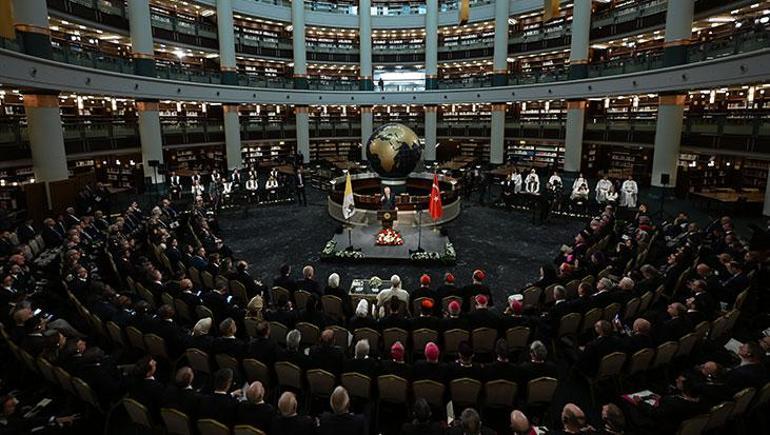 Cumhurbaşkanı Erdoğan ve Papa 14. Leo, ikili görüşmesinin ardından dünyanın en büyük 3. kütüphanesi konumunda olan Cumhurbaşkanlığı Millet Kütüphanesi’ndeki Cihannüma Salonu’nda basın toplantısı düzenledi.