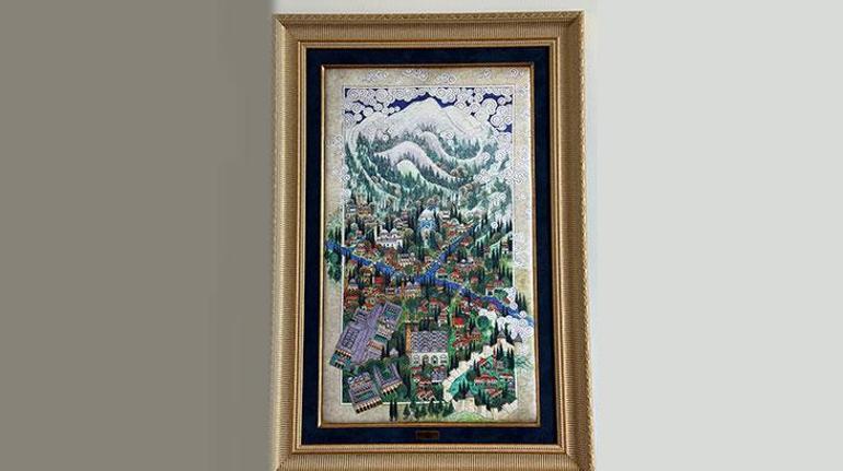 Papa 14’üncü Leo’ya Osmanlı’nın ilk başkenti Bursa’yı, Uludağ’dan aşağıya doğru bir “cennet tasviri” üslubuyla gösteren geleneksel bir minyatür de takdim edildi. Bursa ipeği üzerine yapılan eser, Tarihi İpek Yolu mirasına işaret ediyor. Eserde Bursa’nın en değerli ticari sembolü olan ipek, şehrin kimliğiyle bütünleşiyor. Nusret Çolpan çizimi olan modern minyatür, Yeşil Bursa’nın tarihini ve ipekçilik mirasını sanatla buluşturuyor.