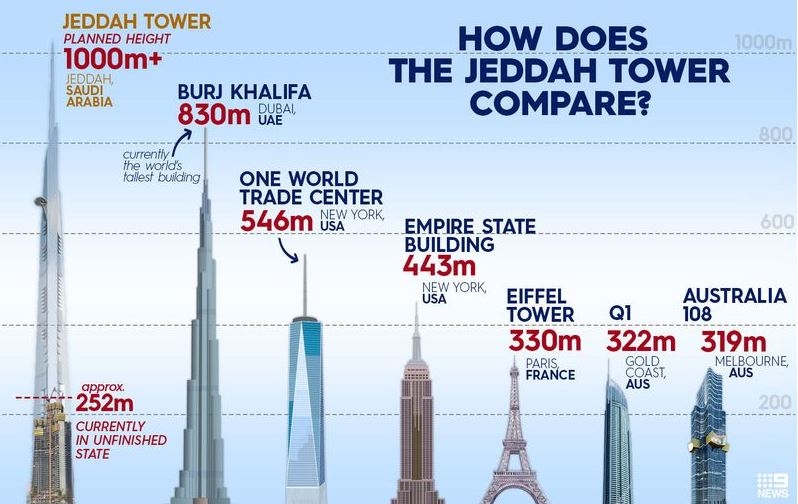 Binanın nihai yüksekliği henüz açıklanmadı ancak mimarlık firması AS+GG (Adrian Smith + Gordon Gill), yapının 1 kilometreyi aşacağını yeniden doğruladı. Bu yükseklik, 828 metre yüksekliğiyle şuadan dünyanın en uzun binası olan Burj Khalifa’yı geride bırakacak. Aynı zamanda ABD’nin en yüksek gökdeleni One World Trade Center’ın neredeyse iki katı, Avrupa’nın en yüksek yapısı Shard’ın ise üç katından fazla yüksekliğe sahip olacak.