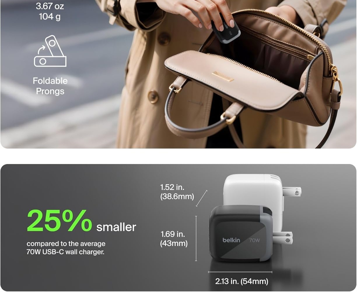 Belkin BoostCharge Pro 3-Port 70W duvar tipi şarj adaptörü minik boyutlarına rağmen 70W seviyesinde enerji vererek çok hızlı bir şekilde cihazlarınızı şarj etmenizi sağlıyor. Tek USB Tip-C portundan 70W enerji alabildiğiniz adaptör iki porttan 45W+25W, 3 porttan ise 45W+12W+12W enerji çekebiliyor.