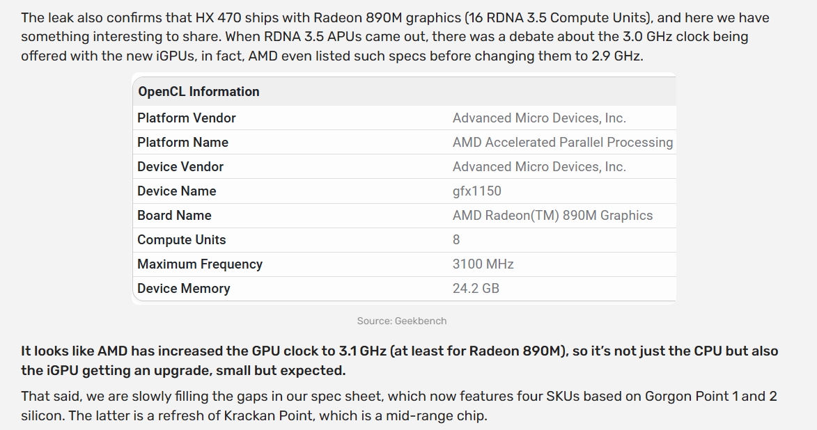 En dikkat çekici yenilik ise RDNA 3.5 iGPU tarafında. Radeon 890M olarak listelenen grafik birimi, 16 RDNA 3.5 Compute Unit ile geliyor ve bu sızıntıda 3.1 GHz maksimum frekans kaydedilmiş. RDNA 3.5 APU’ların tanıtım döneminde 3.0 GHz seviyesinin tartışıldığı biliniyordu ancak AMD’nin bazı belgelerde bu hızı 2.9 GHz’e çektiği görülmüştü. Yeni sonuçlar, en azından 890M için iGPU tarafında ufak bir frekans artışı sağlandığını doğruluyor. HX 470’in çok çekirdek performansında ise belirgin bir artış söz konusu. Üst modele ait maksimum boost hızının 5.25 GHz’e ulaştığı daha önce dile getirilmişti. Teni sonuçlar ise 5.15–5.25 GHz aralığını işaret ediyor.