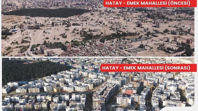 Bakan Kurum, yeniden inşa ve ihya çalışmaları sonrası Emek Mahallesi’ndeki değişimi eski ve yeni halinin fotoğraflarıyla gösterdi: Bu mahalle vatandaşlarımızın buradaki mezarlıktan evinin (yerini) bulabildiği bir halden bugün 6 bin konutuyla, 655 iş yeriyle, sosyal donatılarıyla modern, sağlıklı, güvenli bir mahalleye dönüştü. Bu bizim emeğimiz. Bu alın terinin, çalışmanın, gayretin ürünü. Bu depremzede kardeşlerimizin, bütün ekibimizin emeği. Hamdolsun burada milletimiz, huzur ve güven içerisinde oturmaya başlayacak. Bugün Hatay’ın hangi mahallesine, sokağına gitseniz bu manzara ile karşılaşabiliyorsunuz. O gün enkazların arasından çıkan umut, bugün yeşerdi, filizlendi, büyük bir çınara dönüştü. Büyük bir mutlulukla söylüyorum ki bu mahalle artık Cumhuriyet Caddesi’ne, 75. Yıl Bulvarına oradan Atatürk Caddesi’ne bağlanan, kaldırımında huzurla, güvenle yürüyeceği bir mekan olarak milletimizin hizmetine sunuldu.