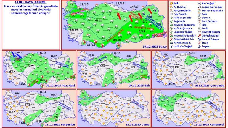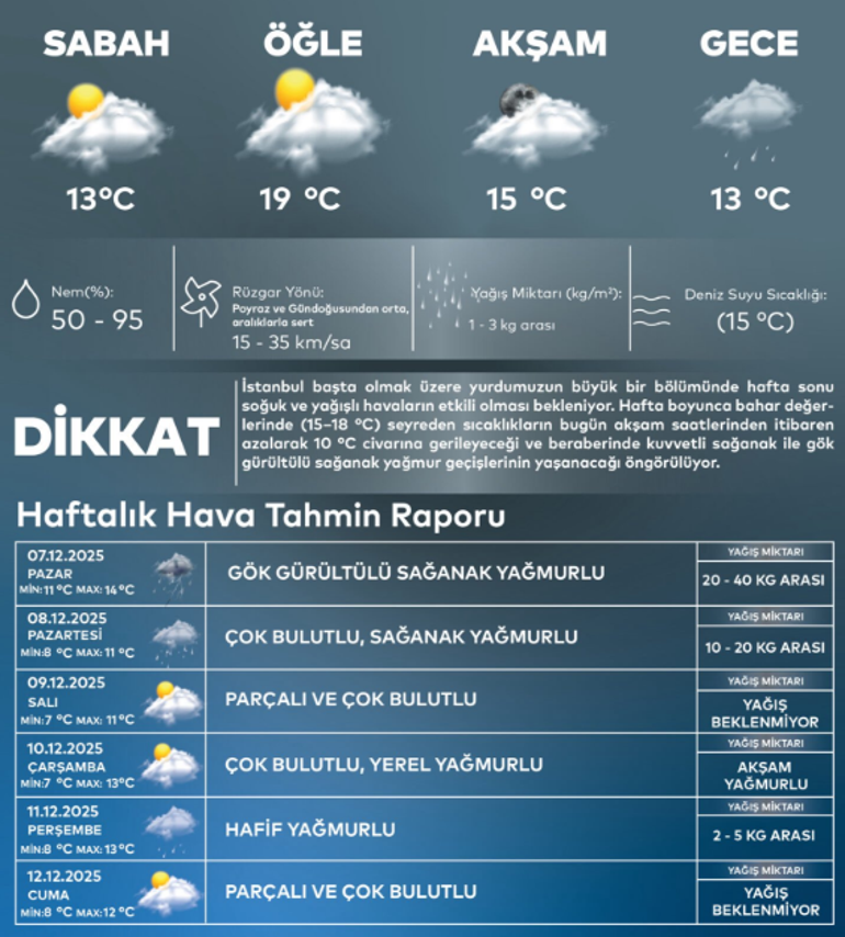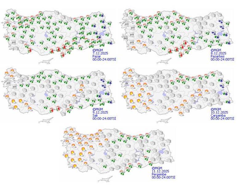 Meteoroloji Genel Müdürlüğü tarafından yapılan tahminlere göre: Ülkemiz genelinin çok bulutlu, Güney Ege ile Çanakkale, İzmir, Zonguldak, Bolu ve Karabük çevreleri dışında kalan bütün bölgelerimizin aralıklı yağışlı geçeceği tahmin ediliyor. Genellikle yağmur ve sağanak, Akdeniz kıyılarında yer yer gök gürültülü sağanak, Doğu Karadeniz’in iç kesimlerinin yüksekleri ile Doğu Anadolu’nun kuzey ve doğusunda karla karışık yağmur ve yer yer kar şeklinde görülecek olan yağışların; Doğu Anadolu’nun güney ve batısı, Güneydoğu Anadolu’nun kuzeyi ile Kırklareli, İstanbul, Bursa, Balıkesir ve Yalova çevreleri, Antalya’nın doğu kıyıları, Erzurum’un güneyinde kuvvetli, Hakkari ve Şırnak çevrelerinde yer yer çok kuvvetli olması bekleniyor. Doğu Karadeniz’in iç kesimleri ile Doğu Anadolu’nun kuzey ve doğusunda buzlanma ve don olayı görüleceği tahmin ediliyor. Sabah ve gece saatlerinde İç Ege, İç Anadolu ve Batı Karadeniz’in iç kesimlerinde pus ve yer yer sis bekleniyor.