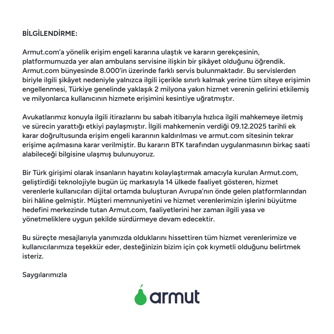 Armut.com, Sağlık Bakanlığı’nın tarafından yapılan talep sonucunda 5651 sayılı Kanun’un 8/A maddesi kapsamında erişime engellenmişti. İstanbul Anadolu 7. Sulh Ceza Hakimliğinin 4 Aralık 2025 tarihli ve 2025/10762 sayılı kararıyla erişime engellenen Armut.com, 9 Aralık 2025 tarihli ek karar ile erişime açıldı.
