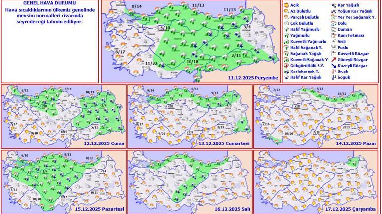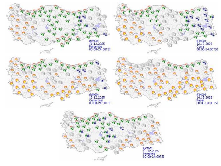 Öte yandan yurtta 1 hafta boyunca, özellikle haftanın ilk günlerinde yurdun büyük bölümünde yağış etkili olurken, Orta ve Doğu Karadeniz ile Doğu Anadolu’da yer yer karla karışık yağmur ve kar yağışları görülecek. Hafta sonuna doğru ise yağışların azalmasıyla birlikte batı ve güney bölgelerde güneşlenme artacak, İstanbul’da zaman zaman hafif yağmur geçişleri, Ankara’da yağışlı ve soğuk günlerin ardından kısmi açılmalar, İzmir’de ise büyük ölçüde parçalı bulutlu ve sakin bir hava hâkim olacak.