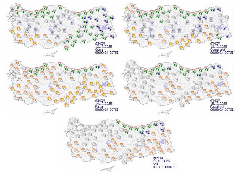 Meteoroloji Genel Müdürlüğü tarafından yapılan tahminlere göre: Ülkemizin kuzey, iç ve doğu kesimleri parçalı ve çok bulutlu, Marmara’nın kuzeyi, Karadeniz (Çorum Haric), Doğu ve Güneydoğu Anadolu ile Sivas, Niğde, Nevşehir, Kayseri, Hatay, Kahramanmaraş, Osmaniye ve Adana’nın doğusunun yağışlı geçeceği tahmin ediliyor. Yağışların kıyı ve iç kesimlerde yağmur ve sağanak, Karadeniz’in iç kesimleri, Doğu Anadolu ile Sivas ve Kayseri’nin yükseklerinde karla karışık yağmur ve kar şeklinde olması bekleniyor. Gece ve sabah saatlerinde iç kesimlerde pus ve yer yer sis bekleniyor.