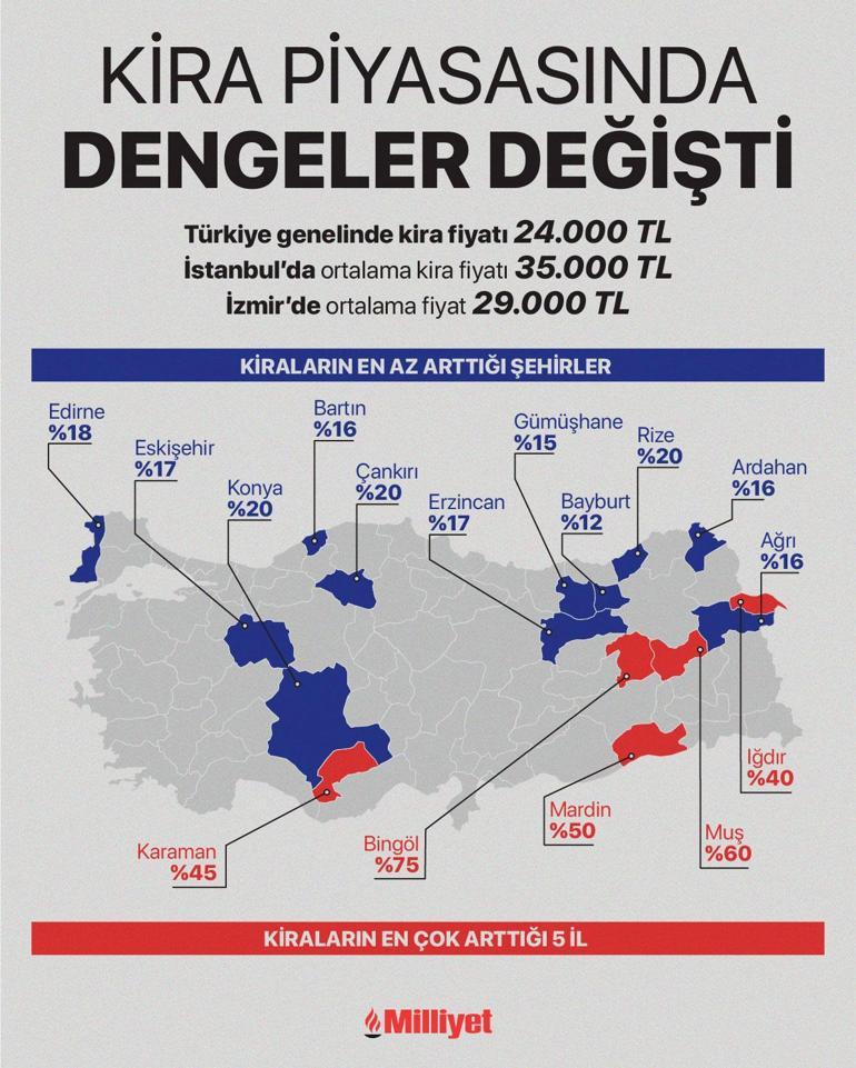 Bingöl, Muş, Mardin gibi illerde %50’nin üzerinde kira artışları var. Bingöl’de %75, Muş’ta %60, Mardin’de %50, Karaman’da %45 ve Iğdır’da %40 seviyelerinde fiyatlar yükseldi diyebiliriz.