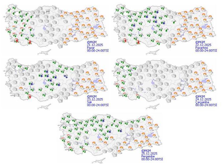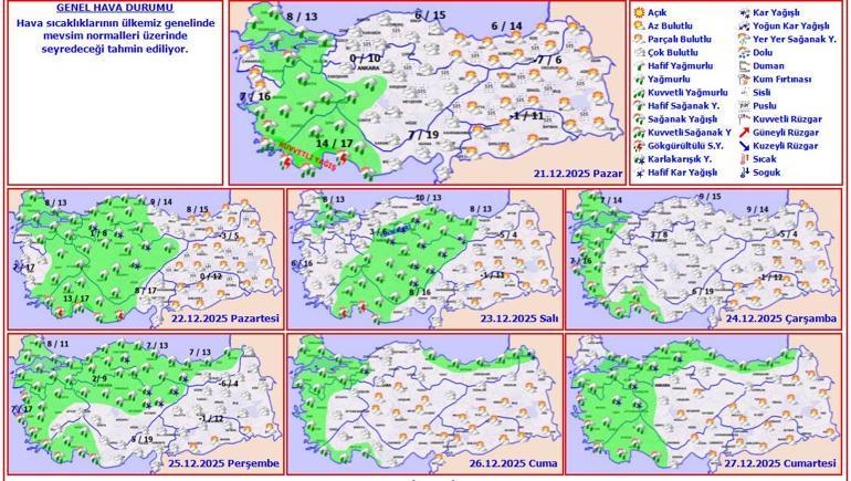 Bu hafta Türkiye genelinde hava sıcaklıklarının mevsim normallerinin üzerinde seyretmesi bekleniyor. Haftanın ilk günlerinde özellikle Ege, Akdeniz ve Marmara’nın batısında yağmur ve yer yer kuvvetli yağışlar etkili olurken, iç ve doğu kesimlerde parçalı bulutlu, sisli ve yer yer puslu hava görülecek. Hafta ortasında yağışlar batı bölgelerde aralıklarla devam ederken, yüksek kesimlerde karla karışık yağmur ve hafif kar ihtimali bulunuyor.