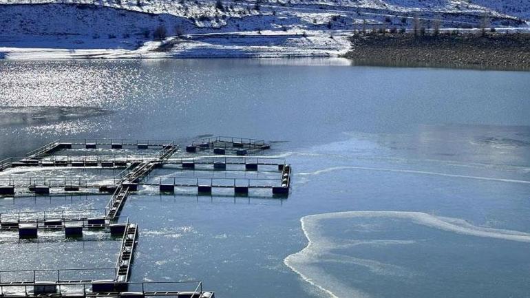 Su ürünleri kafeslerinin buzla çevrildiği gölette, donan su yüzeyi dikkat çekiyor. Öte yandan göletin etrafını saran ve karla kaplanan dağlar, ortaya çıkan manzaraya ayrı bir güzellik katıyor.