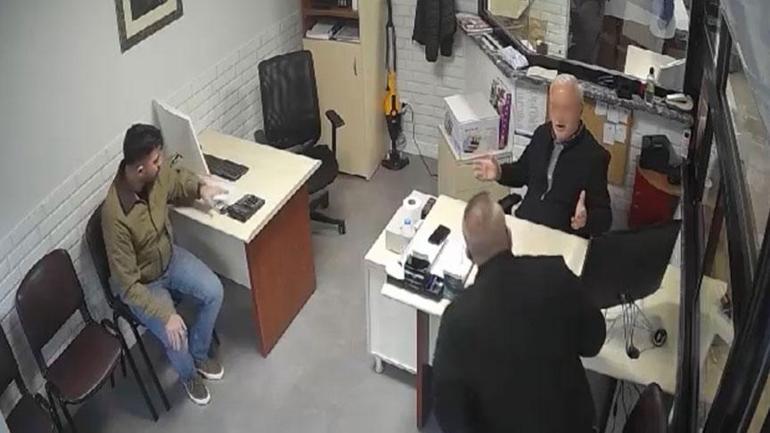 Burada iki kişi Naim G.’nin odasına gelerek, oğlunun Mahmut E. ile ticaret yaptığını ve kendisinden alacağı olduğunu iddia etti. Naim G. ise oğluyla yaklaşık 10 yıldır görüşmediğini söyleyerek oğlunun borcunun kendisini ilgilendirmediğini ifade etti. Bu cevap sonrasında sinirlenen 2 kişiyle Naim G. arasında tartışma çıktı. Tartışmada şüpheli 2 kişi Naim G.’yi ‘Bu işi başka şekilde halledeceğiz’ diyerek tehdit ettikten sonra iş yerinden ayrıldı. Yaşananlar güvenlik kamerasına saniye saniye yansıdı.