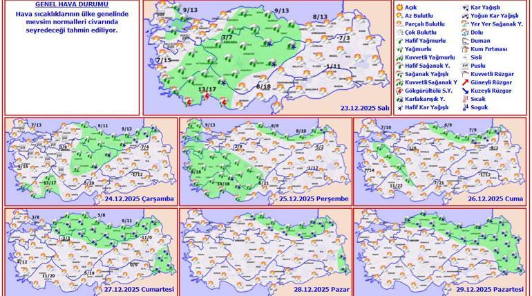 Meteoroloji Genel Müdürlüğünden alınan tahminlere göre, ülkemiz genelinin parçalı ve çok bulutlu, Batı Akdeniz, İç Anadolu’nun kuzey ve batısı, Batı Karadeniz’in iç kesimleri, Orta Karadeniz ile İstanbul, Kocaeli, Sakarya, Yalova, Muğla, Denizli ve Afyonkarahisar çevrelerinin aralıklı yağışlı geçeceği tahmin ediliyor. Yağışların, genellikle yağmur ve sağanak, Batı Akdeniz kıyılarında gök gürültülü sağanak, Batı Karadeniz’in iç kesimleri ile İç Anadolu’nun kuzeydoğusunun yükseklerinde karla karışık yağmur ve yer yer kar şeklinde olması bekleniyor. Sabah ve gece saatlerinde Marmara ile iç ve doğu bölgelerde pus ve yer yer sis bekleniyor.