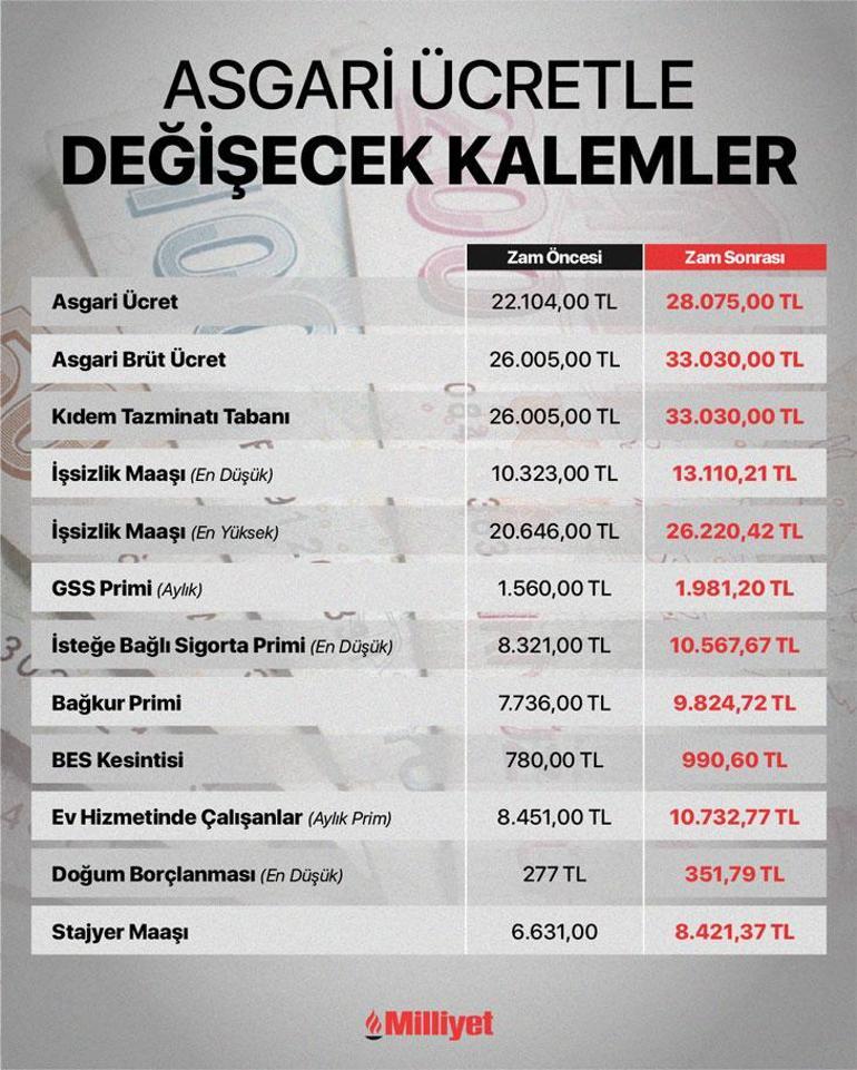 Asgari ücrete yeni yılda yapılan zamla birlikte işsizlik maaşı, Genel Sağlık Sigortası (GSS) primi, isteğe bağlı sigorta primi, BAĞ-KUR primi, Bireysel Emeklilik kesintisi, ev hizmetinde çalışanların primleri, doğum, askerlik, borçlanması gibi ödeme ve ücretler de değişti.