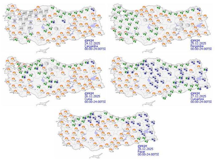 Hafta boyunca kuvvetli (20-50km/s) kuzeyli rüzgarlar ile birlikte aralıklarla sağanak yağmur geçişlerinin yaşanacağı, halihazırda 11-13°C aralığında mevsim normalleri üzerinde seyreden sıcaklıkların Cuma gününden itibaren azalarak 10 derecelerin altına, pazar akşam saatlerinden itibaren ise 5 derecelerin altına kar değerlerine gerileyeceği öngörülüyor.