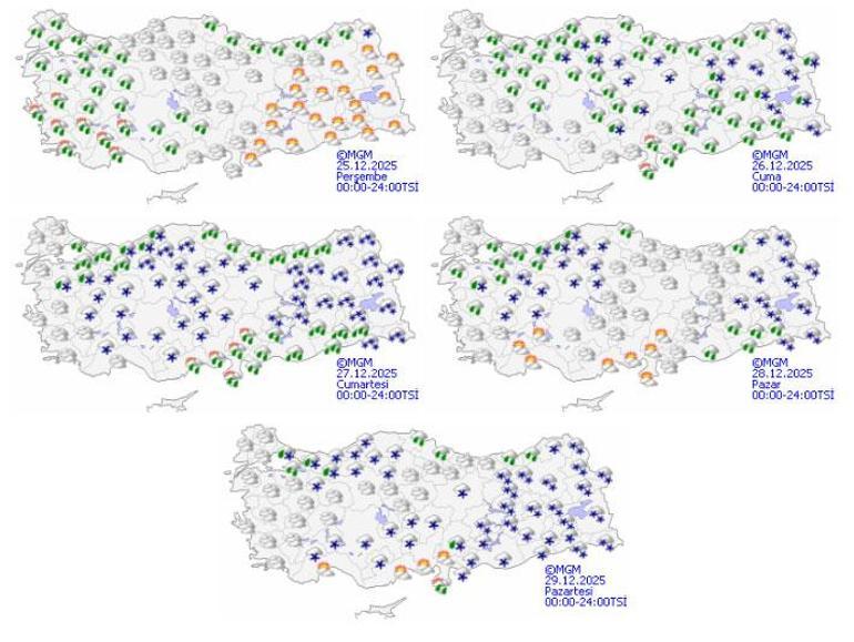 26 Aralık ile 2 Ocak 2026 tarihleri arasında beklenen en düşük hava sıcaklığının, Ankara’da sıfırın altında 3, İstanbul’da 0, İzmir’de 1, Konya’da sıfırın altında 8, Kocaeli’de sıfırın altında 1, Bolu’da sıfırın altında 6, Samsun’da 2, Trabzon’da 4, Tokat’ta sıfırın altında 7, Erzurum’da sıfırın altında 17, Eskişehir’de sıfırın altında 5, Afyonkarahisar’da sıfırın altında 10, Balıkesir’de sıfırın altında 3 ve Sivas’ta sıfırın altında 13 derece olacağı tahmin ediliyor.