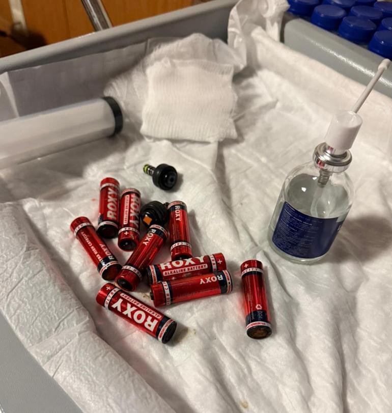 Endoskopik müdahaleye hastanın durumu ve görüntüleme sonucu karar verildiğini belirten Dr. Öğretim Üyesi Adem Aslan, “Midede bulunan 9 adet kalem pili endoskopik yöntemle tek tek çıkardık. Pillerin mide içinde kalması durumunda kimyasal yanık, kanama ve mide delinmesi gibi ciddi riskler söz konusuydu. Pil sayısının fazla olması bu riskleri daha da artırıyordu. Jiletler için ise mideyi geçtikten sonra bağırsakta sabitlenmemişse ve hastada acil bir belirti yoksa kontrollü şekilde doğal yoldan atılması tercih edilebilir. Bu karar, hastanın anlık durumu ve görüntüleme bulgularına göre verilmiştir” dedi.