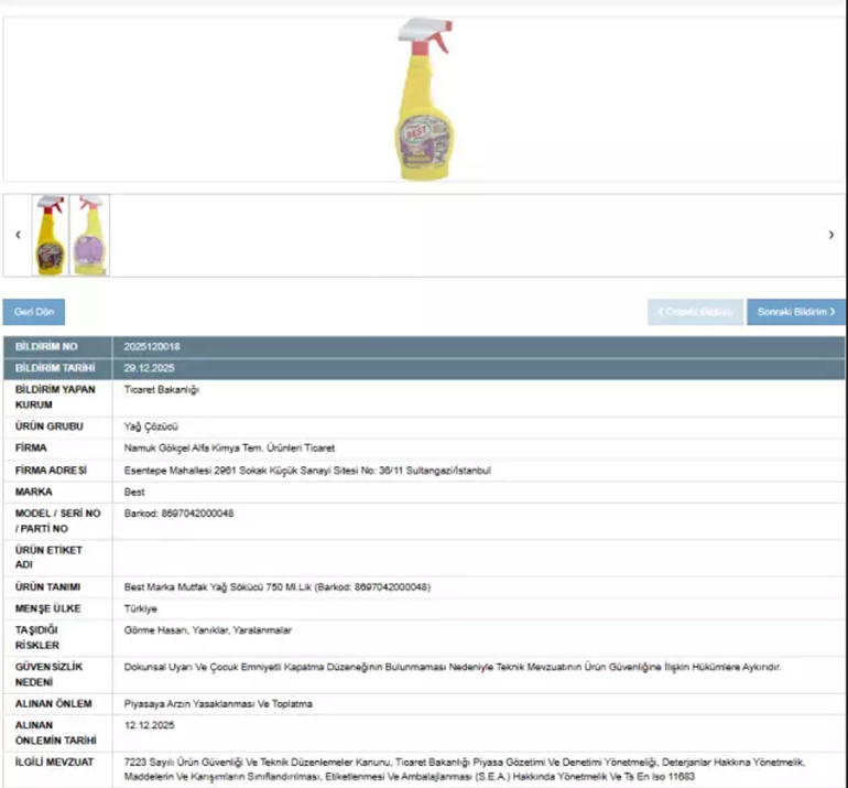 Gerçekleştirilen incelemeler sonucunda, Best markasına ait bir temizlik ürününün kullanımının güvenli olmadığı tespit edildi. Bakanlık, görme bozukluğu, yanık ve yaralanmalara neden olabileceği ifade edilen söz konusu ürünün piyasaya sunulmasını durdurma kararı alırken, halihazırda satışta bulunan ürünlerin de toplatılmasına hükmetti.