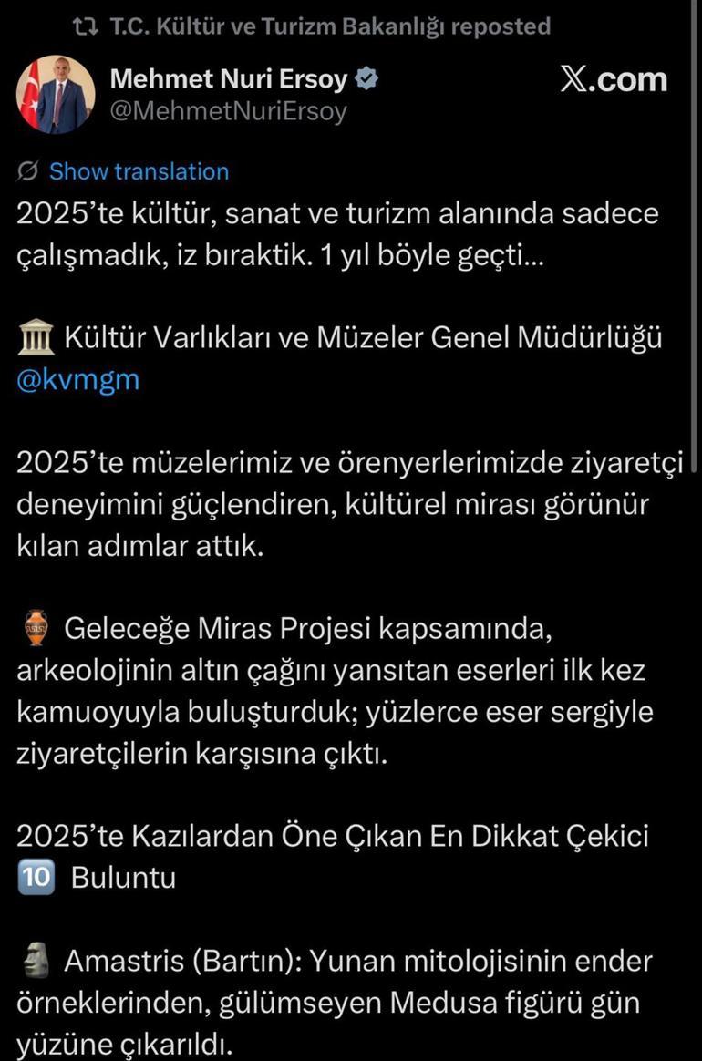 Kültür ve Turizm Bakanı Mehmet Nuri Ersoy, ‘Geleceğe Miras’ projesi kapsamında 2025 yılının en dikkat çekici arkeolojik buluntularını sosyal medya hesabından paylaştı.