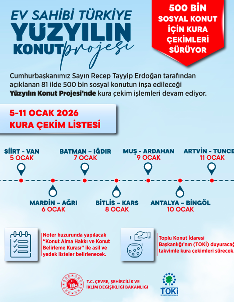 Çevre, Şehircilik ve İklim Değişikliği Bakanlığı, Cumhurbaşkanı Recep Tayyip Erdoğan’ın açıkladığı 81 ili kapsayan “Yüzyılın Konut Projesi” ile Türkiye tarihinin en büyük sosyal konut projesini hayata geçirdi. Proje ile ülke genelinde afet riskine karşı 500 bin güvenli konut inşa edilecek. 10 Kasım 2025’te başlayan ve 19 Aralık 2025’e kadar süren başvuru sürecinde 5 milyon 242 bin vatandaşın başvurusu geçerli sayıldı. İlk kuralar ise 29 Aralık 2025’te deprem bölgesindeki Adıyaman’da çekildi. Ardından Şırnak ve Hakkâri’de de TOKİ koordinesinde kuralar çekilerek hak sahipleri belirlendi.