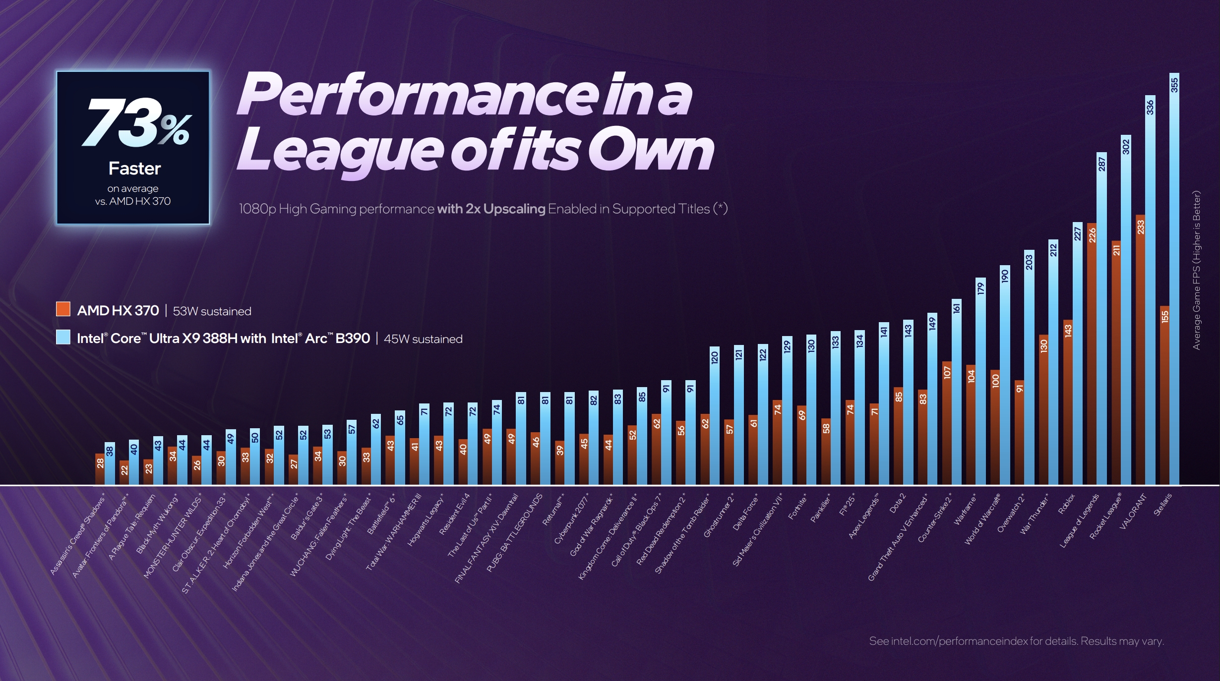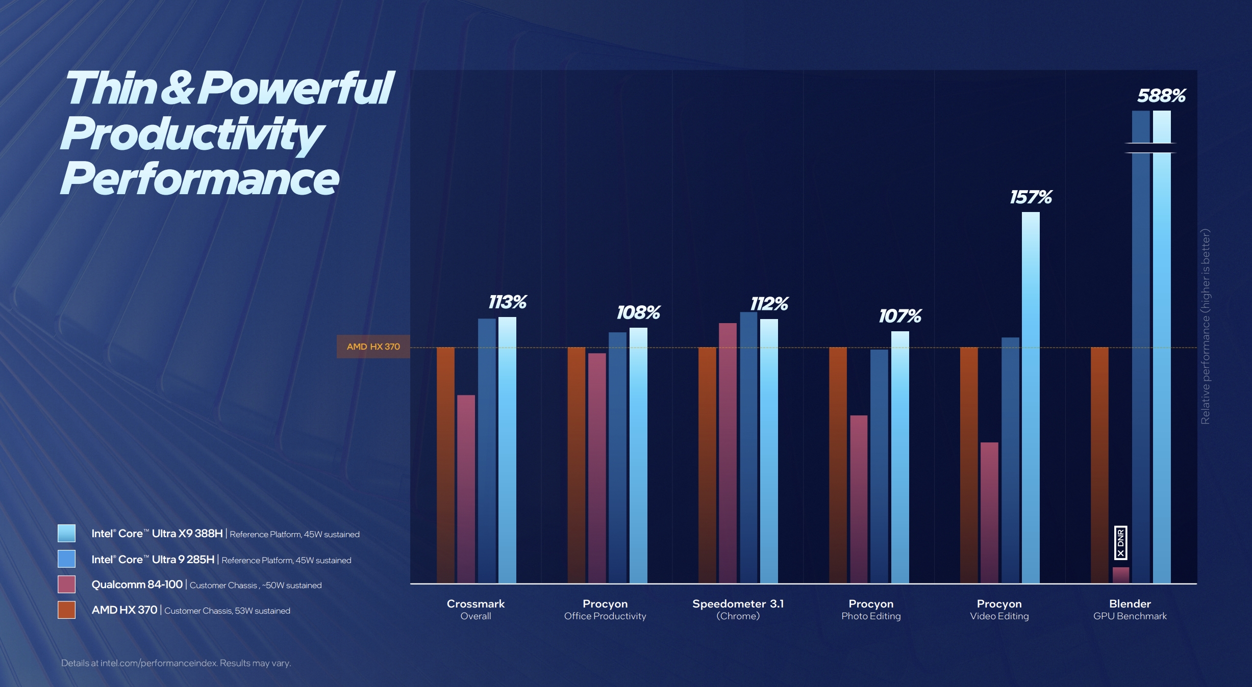 Şirketin resmi performans verilerine göre Core Ultra X9 388H, 25W güç seviyesinde çalışan Core Ultra 9 288V’ye kıyasla Cinebench 2024’te yüzde 60’a varan çok çekirdekli performans artışı sunuyor. Oyun tarafında ise Core Ultra 9 285H’ye göre yüzde 76’ya varan performans kazanımı iddia ediliyor.