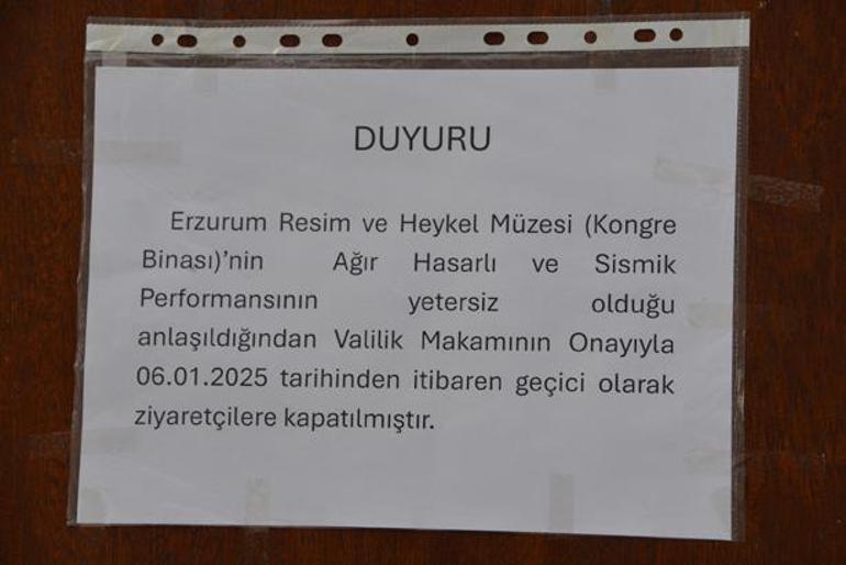 Ahmet Yer, “Rölöve ve Anıtlar Müdürlüğümüzün yaptığı ihale sonucu Erzurum Teknik Üniversitesi (ETÜ) yapının incelenmesi için işi üstlendi. 1 Ağustos 2025 tarihinde ETÜ ile sözleşmeyi imzaladıktan sonra 5 Ağustos’ta yer tesliminde bulunduk. ETÜ’nün alanında uzman heyeti, binamızda inceleme yaptılar. 22 Aralık 2025 tarihinde inceleme raporunu bize sundular. Raporda, binanın ağır hasarlı olduğu ve sismik performansının yetersiz olduğu bildirildi. ETÜ raporunda can ve mal güvenliği açısından kongre binamızın acilen ziyarete kapatılmasını ve en kısa sürede de tahliye edilmesi noktasında bize bir rapor sundular. Bizler de Güzel Sanatlar Genel Müdürlüğümüzle istişareler yaparak gerekli önlemleri aldık. Binamızın can ve mal güvenliği açısından tehdit oluşturması dolayısıyla ziyarete kapatılması noktasında karar aldık” diye konuştu.