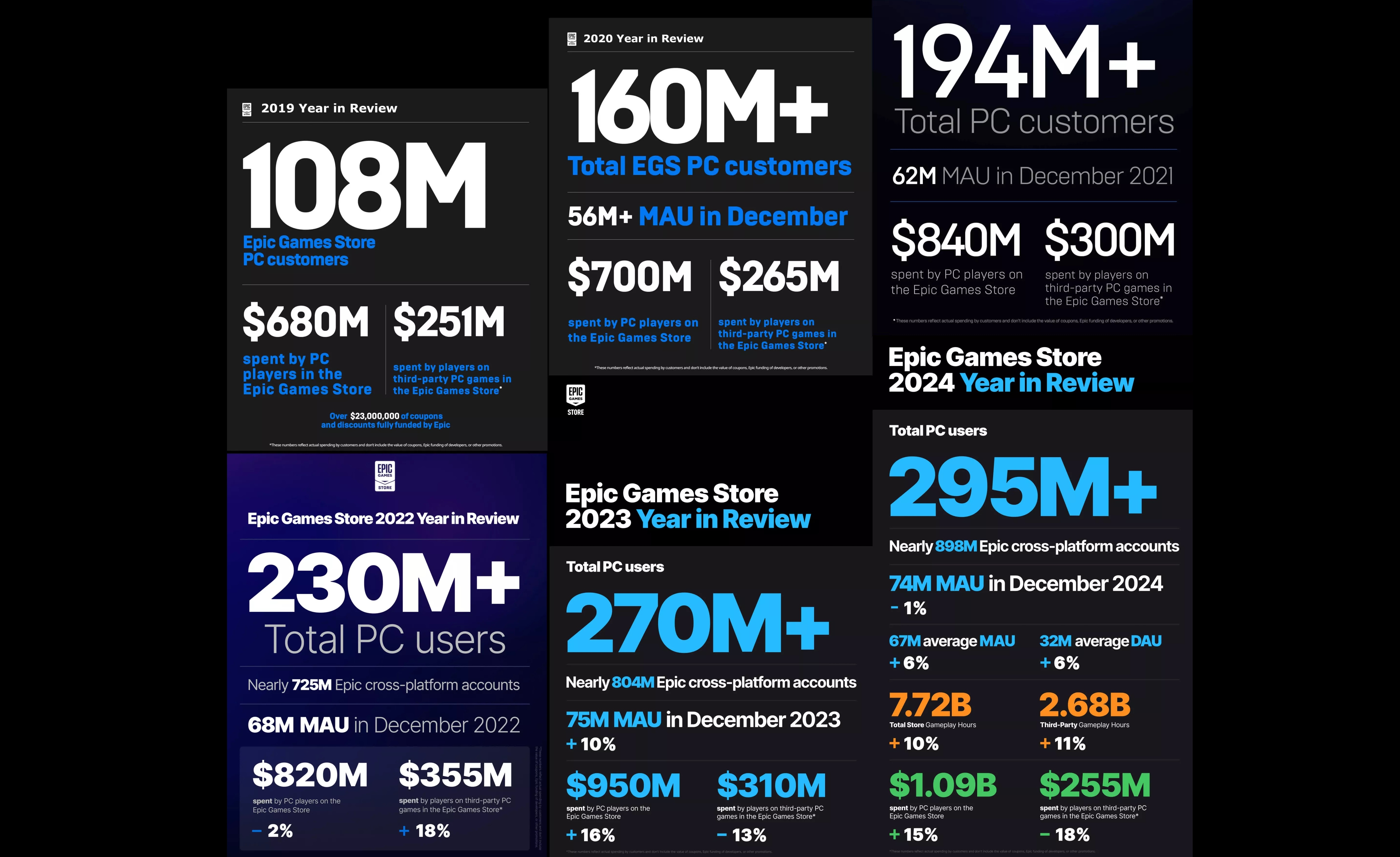 Ayrıca aynı dönemde Epic Games Store’un PC kullanıcı sayısı yüzde 173 artarak 108 milyondan 295 milyona ulaştı. Veriler, birçok kullanıcının mağazayı oyun satın almak yerine ücretsiz dağıtılan yapımları toplamak için kullandığını düşündürüyor. Epic’in yüksek profilli özel oyun hamleleri de beklenen etkiyi yaratmış görünmüyor. Toplam mağaza gelirleri ise farklı bir yönde. Fortnite mikro ödemelerinin etkisiyle Epic Games Store’un toplam geliri 2019’dan 2024’e yüzde 60 artarak 680 milyon dolardan 1,09 milyar dolara yükseldi. Buna karşın üçüncü parti oyun satışlarının toplam gelir içindeki payı her yıl yüzde 50’nin altında kaldı ve 2022’den bu yana gerilemeye devam etti.