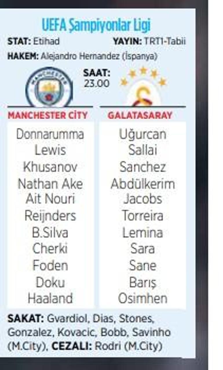 Galatasaray, Şampiyonlar Ligi’nin 8. ve son haftasında bugün İngiliz devi Manchester City ile Etihad Stadı’nda kozlarını paylaşacak. Geride kalan 7 maçta 3 galibiyet, 1 beraberlik ve 3 yenilgi yaşayan Cim-Bom 10 puanla 17. sırada yer alıyor. City ise 13 puanla 11. basamakta bulunuyor. Galatasaray ilk kez karşılaşacağı İngiliz rakibini yenerek, kendini ilk 16’ya atmaya çalışacak. City ise sahasında farklı galip gelerek, lig aşamasını ilk 8’de bitirmenin hesaplarını yapıyor. Son dönemde eksik ve formsuzlar City’de 8 önemli futbolcu maçta forma giyemeyecek.
