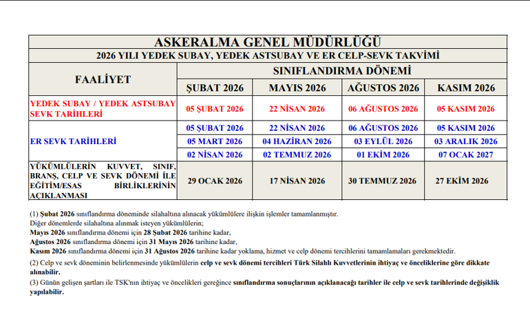Yedek subay ve astsubay adayları ile 1. grup erler 05 Şubat 2026 tarihinde birliklerine teslim olacak. 2. grup erler için sevk tarihi 05 Mart 2026, 3. grup erler için ise 02 Nisan 2026 olarak belirlendi.