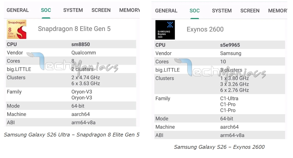 Serinin tepe modeli Galaxy S26 Ultra’nın tüm pazarlarda Snapdragon 8 Elite Gen 5 işlemcisiyle geleceği kesinleşti. Galaxy S26 ve S26 Plus modelleri ise bölgeye göre Snapdragon 8 Elite Gen 5 ve Exynos 2600‘ü kullanacak. TechManiacs’ın paylaştığı sistem bilgileri ve benchmark sonuçları, bu iki yonga setinin performans farklarını ortaya koydu.