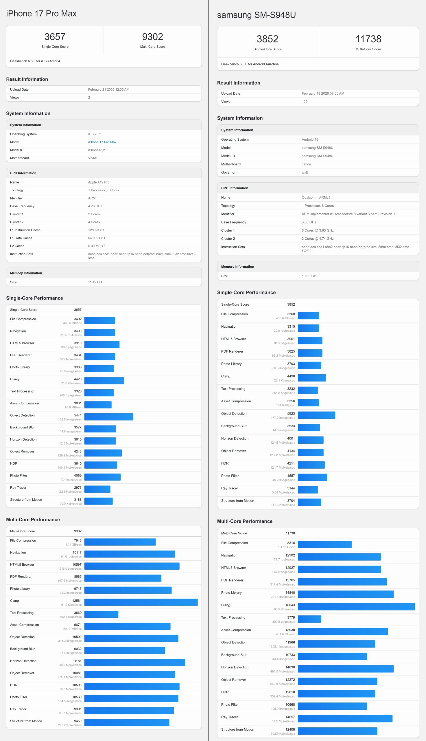 Samsung S26 Ultra’nın performansı tek çekirdekte inanılmaz bir şekilde 3.852 puan, çok çekirdekte 11.738 puana ulaştı. Geçen yılki Ultra modeli, tek çekirdekte 3.761, çok çekirdekte 11.454 puan almıştı. Puan artışı ufak görünse de, genel tabloya bakmak lazım. Zaten rakiplerinin çoğunu geride bırakan telefon, şimdi kendi rekorunu kırdı. Bu arada, en güçlü rakibi olarak gösterilen iPhone 17 Pro Max, tek çekirdek 3.657 puan, çok çekirdekte 9.302 puan aldı. Performans testinin ABD’de satılacak modelle yapıldığı bildiriliyor. Cihaz, 12 GB RAM ve Android 16 ile geliyor. İşlemci, iki ana çekirdeği 4,74 GHz’de çalışan çift kümeli bir tasarıma sahip.