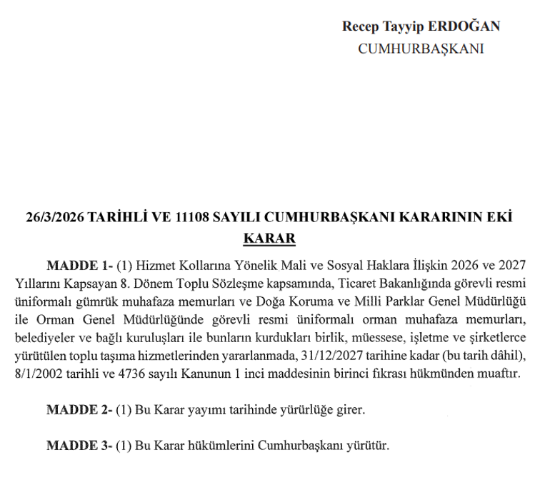Bugünden itibaren geçerli olmak üzere gümrük muhafaza memurları ve orman muhafaza memurları, belediyelere ait toplu taşıma araçlarından 31 Aralık 2027 tarihine kadar ücretsiz yararlanma hakkı kazandı.
