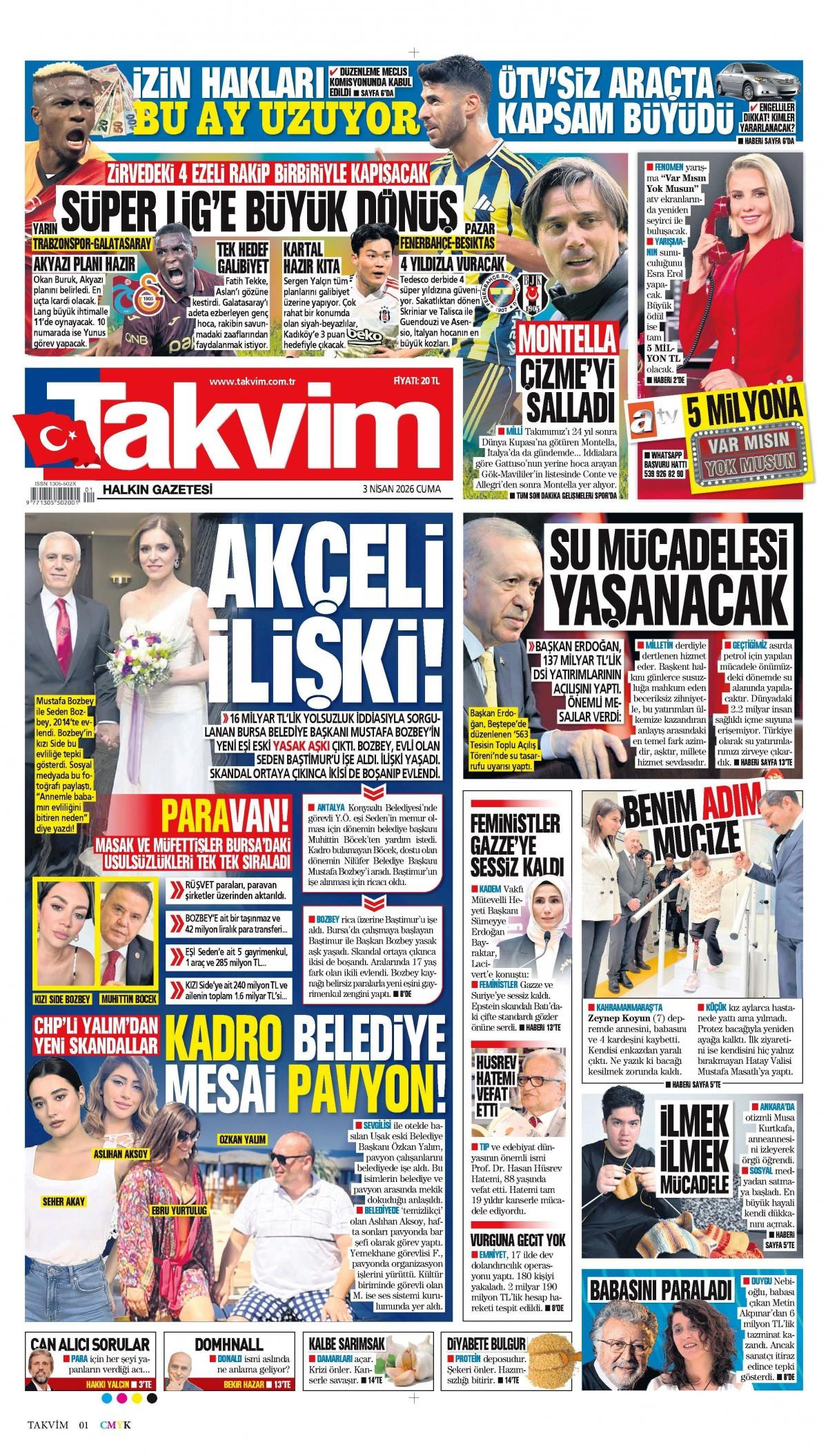 Takvim Gazetesi 3 April 2026, Friday Günü Manşeti